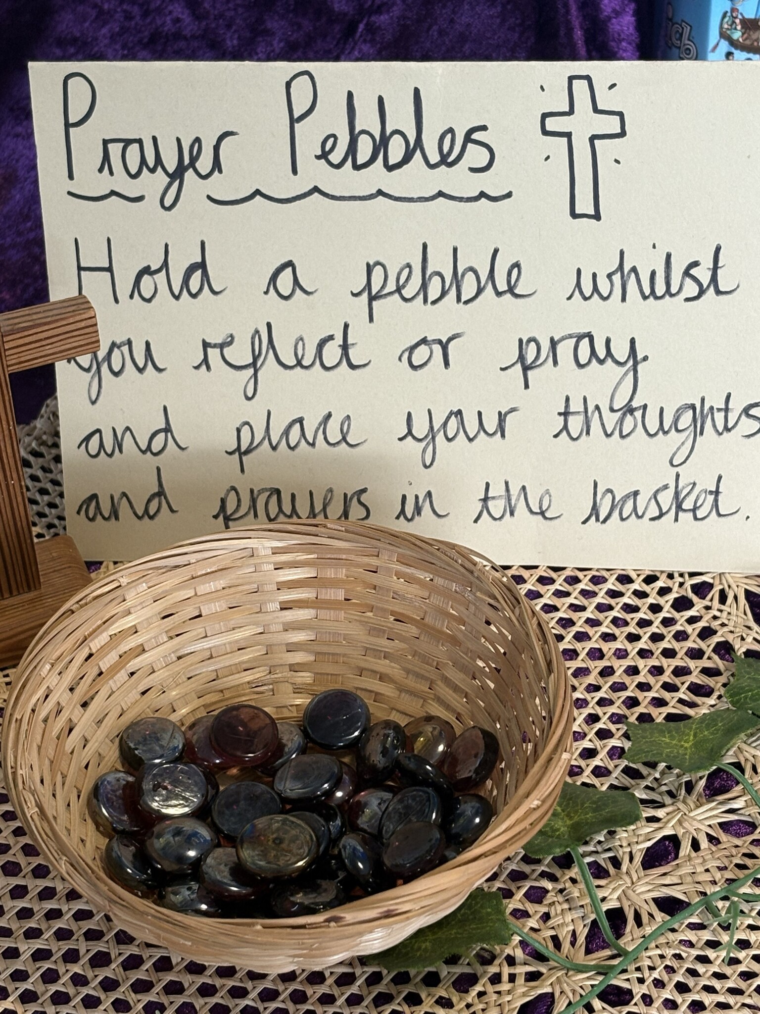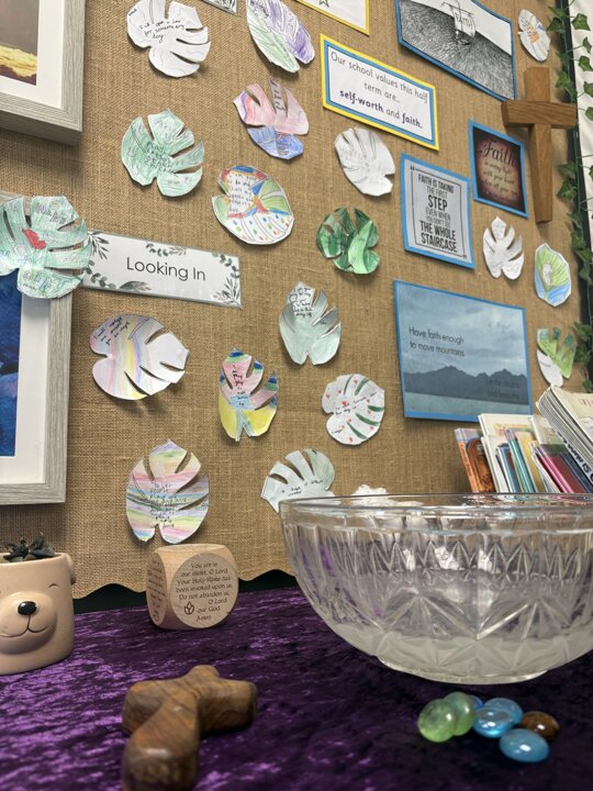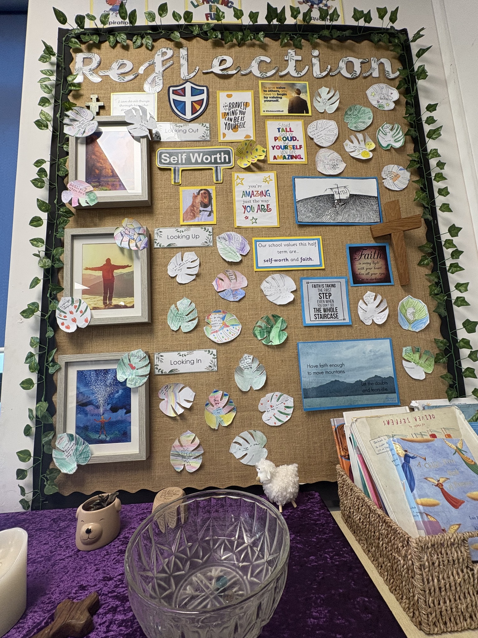 Every class has its own ‘Reflection Area’ to support and celebrate opportunities to be still, reflect, pray and contribute to the Big Questions our children wish to explore. All classes follow a half-termly theme and can talk confidently about this. The cloths on our reflection areas reflect the liturgical colours of the Church Calendar.