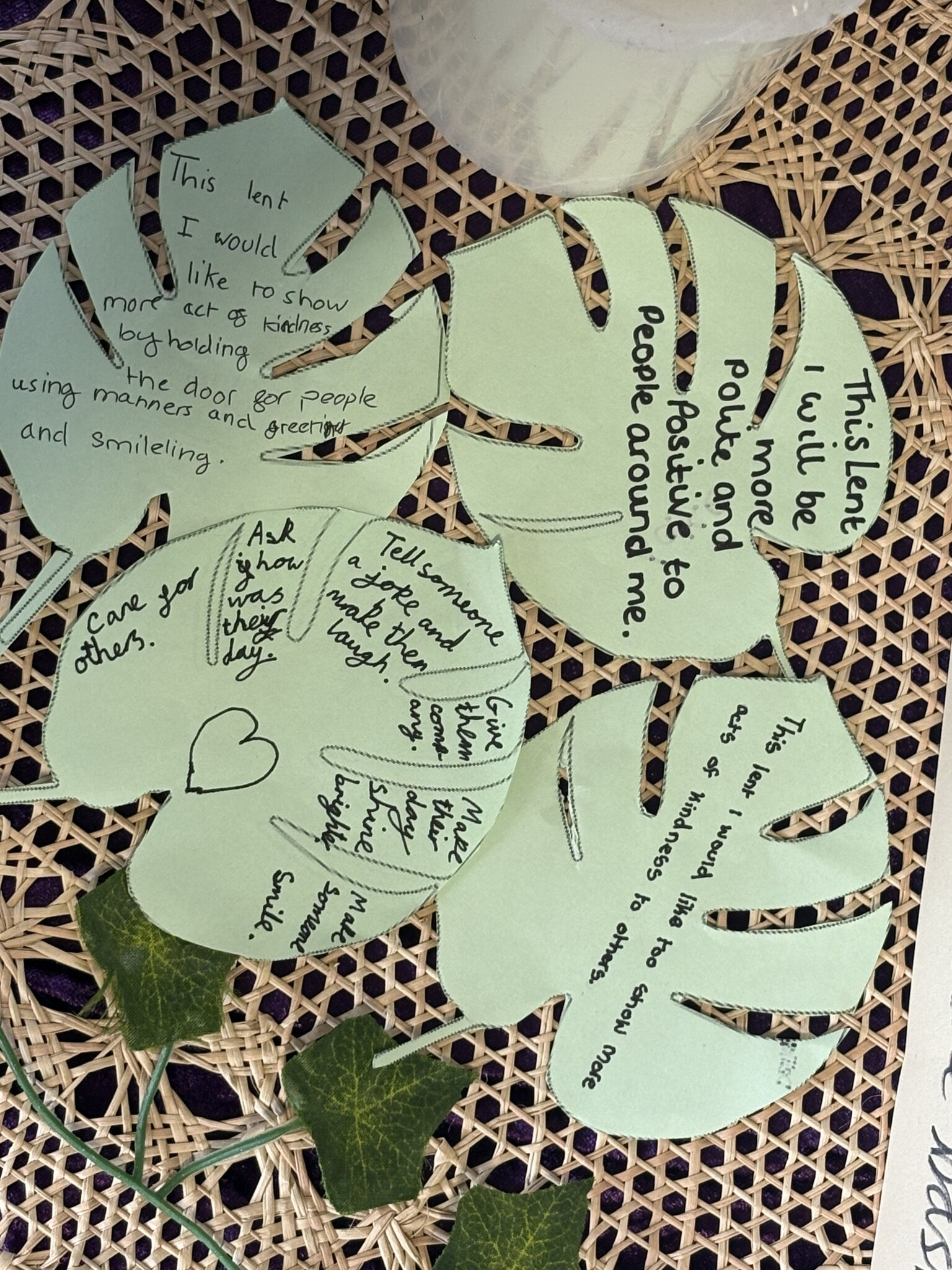 During worship, our children are invited to reflect or contribute spiritually to weekly ‘Challenges’ held in a communal book or displayed on our Reflection Table. The children are frequently asked to consider their lives and experiences and to make links and connections to these with the teachings of Jesus and Bible stories.
